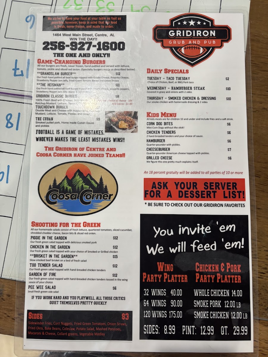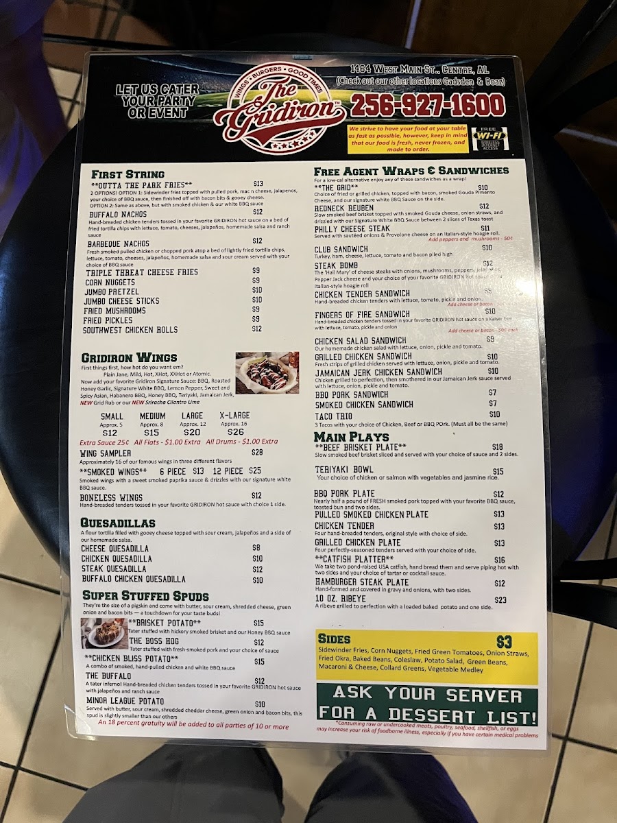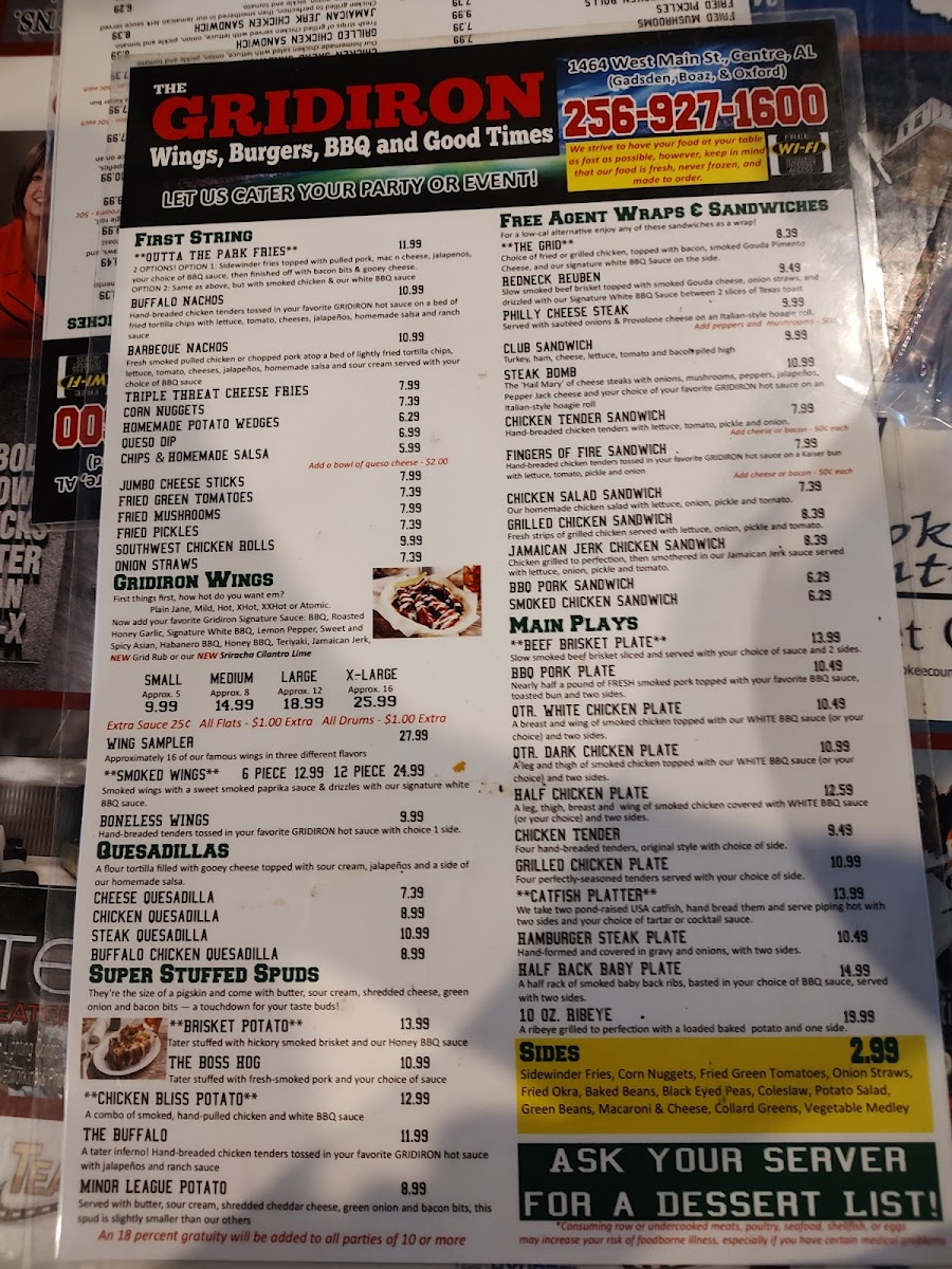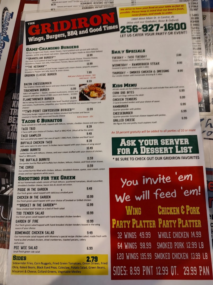 The Gridiron Grub and Pub, located on West Main Street in Centre, Alabama, delivers a lively sports-pub atmosphere paired with a menu of satisfying American comfort food and refreshing drinks. Designed as a gathering place for friends, families, and sports fans, the menu features a wide variety of pub favorites including stacked burgers, crispy wings, loaded sandwiches, shareable appetizers, and hearty entrées. A selection of beers, soft drinks, and classic pub beverages complements the food, making it easy to settle in for a relaxed meal or game-day outing.