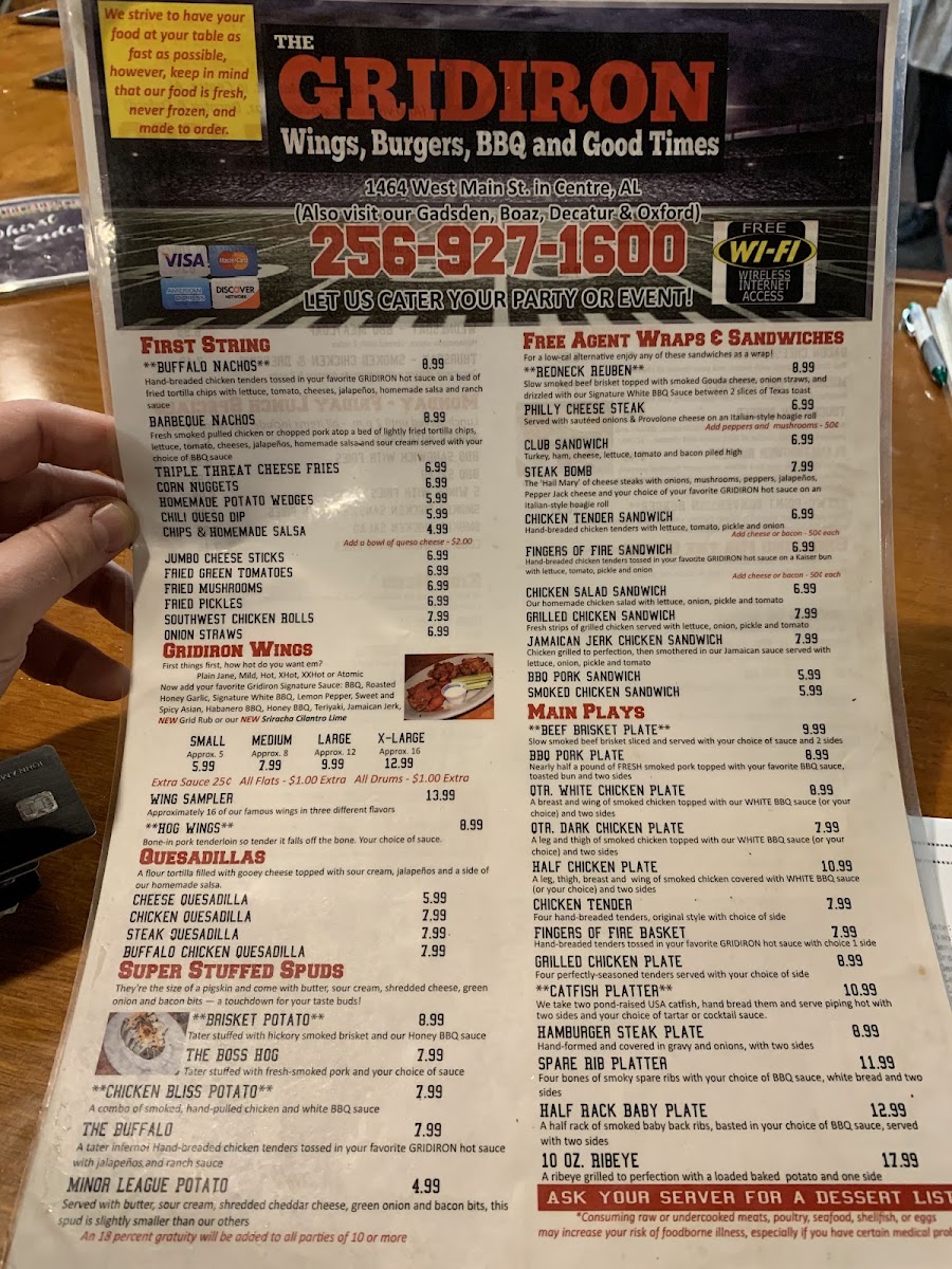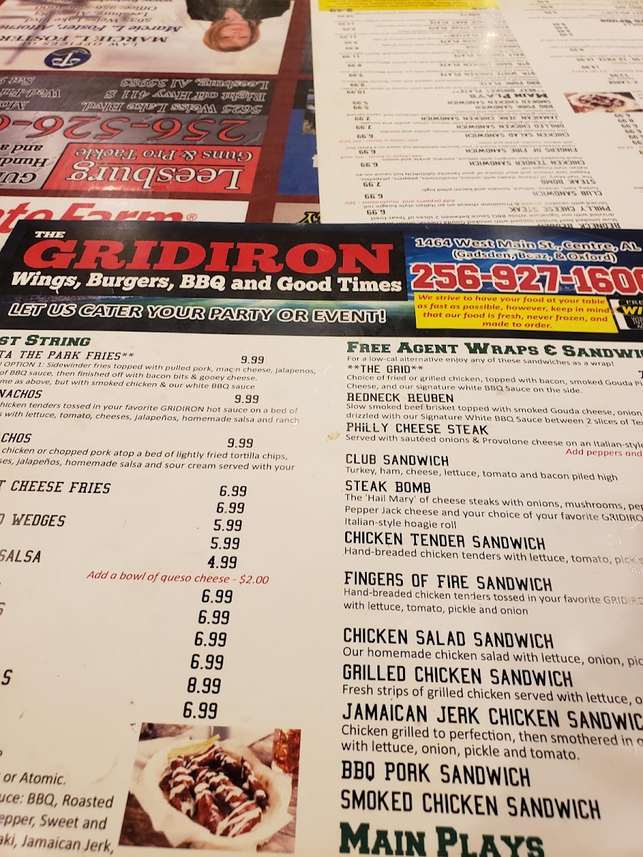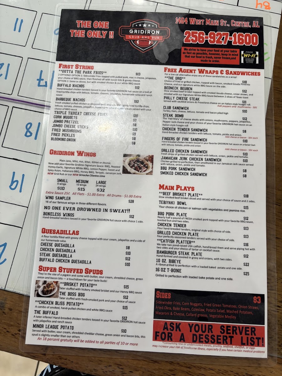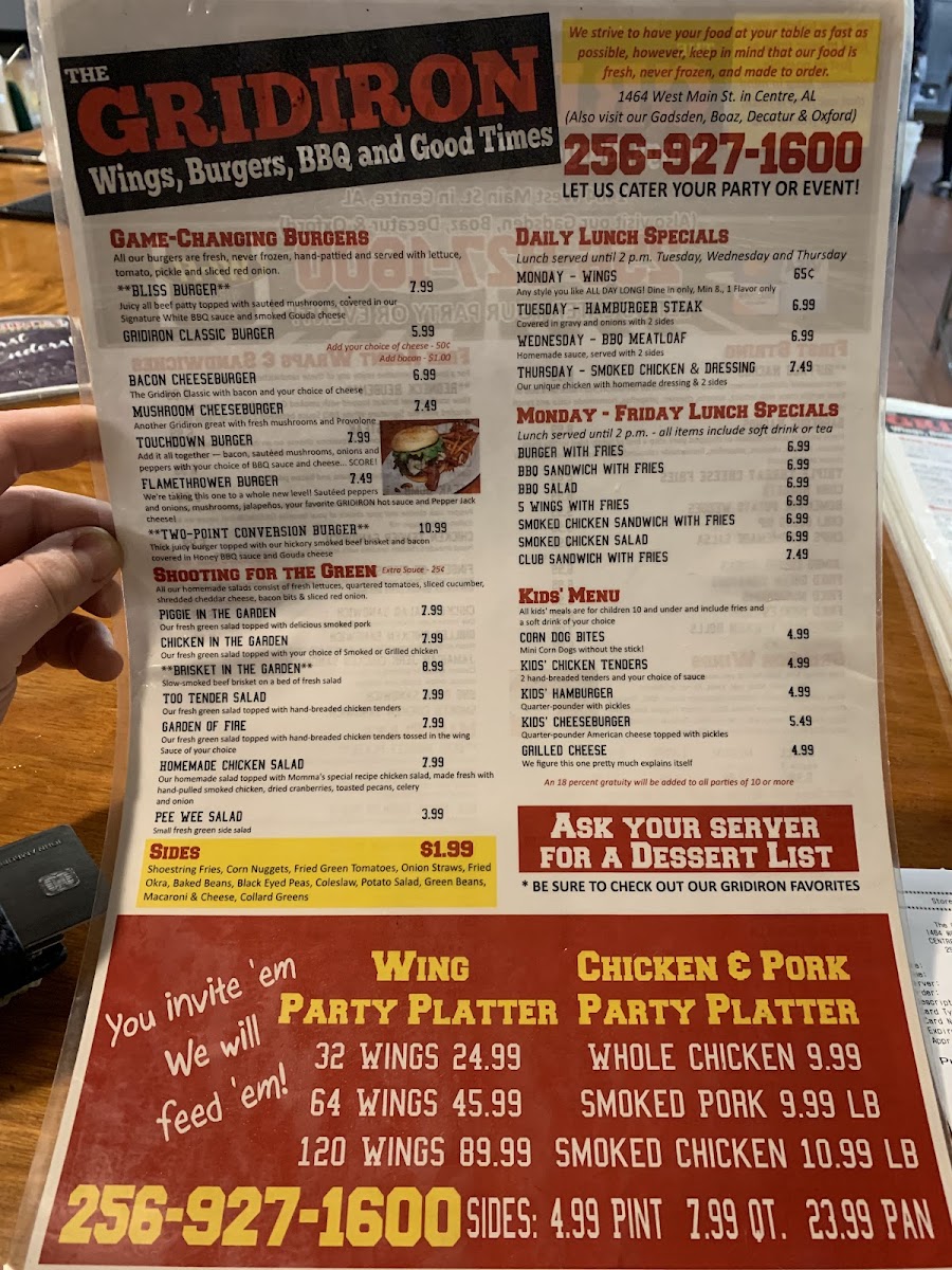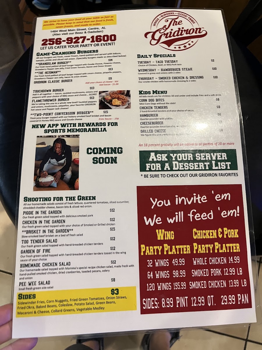 The Gridiron Grub and Pub, located on West Main Street in Centre, Alabama, delivers a lively sports-pub atmosphere paired with a menu of satisfying American comfort food and refreshing drinks. Designed as a gathering place for friends, families, and sports fans, the menu features a wide variety of pub favorites including stacked burgers, crispy wings, loaded sandwiches, shareable appetizers, and hearty entrées. A selection of beers, soft drinks, and classic pub beverages complements the food, making it easy to settle in for a relaxed meal or game-day outing.